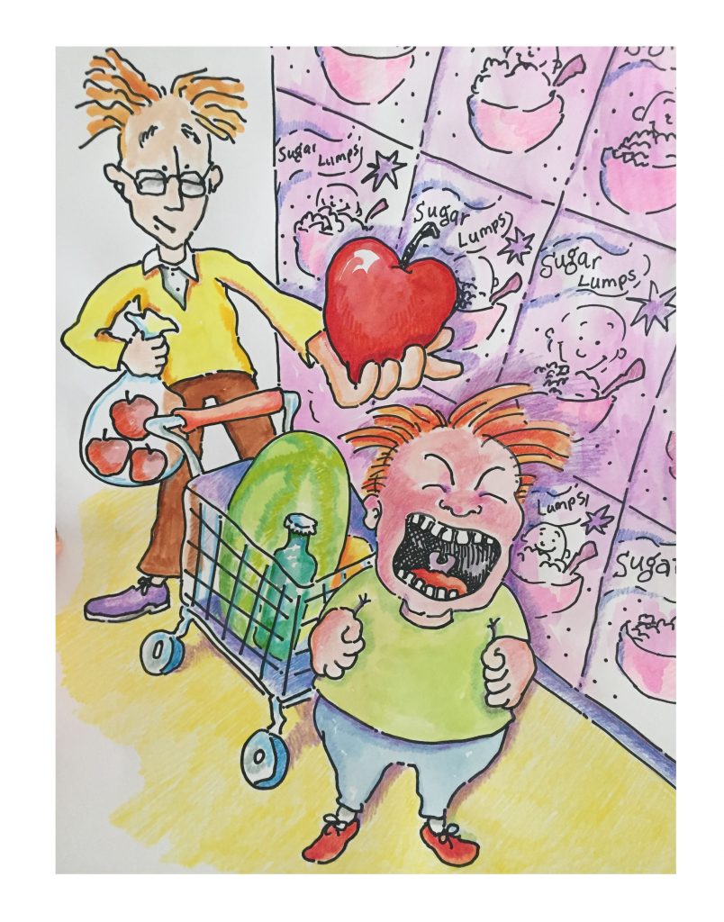 I used to be a member of the Society of Children’s Book Writers and Illustrators. This illustration was entered in a competition they sponsored. Hasn’t everyone experienced a supermarket meltdown? My kids didn’t care a clump about the sugar lumps but the soda aisle was a different story. Yup, I’m an ogre when it comes to things that will rot yer teeth outta yer skull.